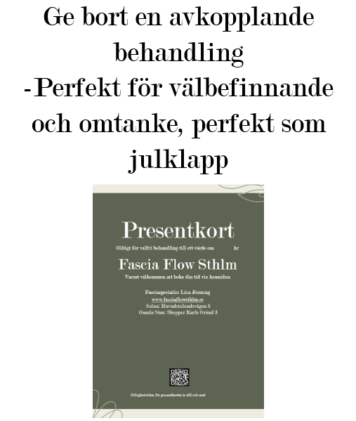 PrislistaFasciabehandling första besök 70min 1200kr Fasciabehandling återbesök 50min 1000kr Fasciabehandling + Ärr första besök 70min 1200kr Fasciabehandling Ärr återbesök 50min 1000kr Lymfbehandling 70min 1200kr När du bokar din tid vänligen meddela önskad behandling samt eventuell bokningskod. Avbokningspolicy |